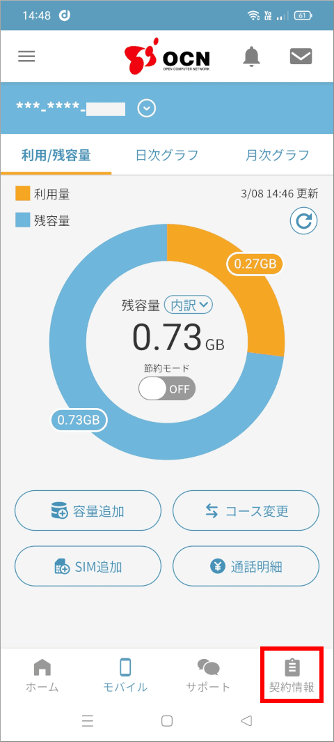 まず、「OCNアプリ」を起動します(ブラウザでOCNマイページに直接アクセスしても構いません)。