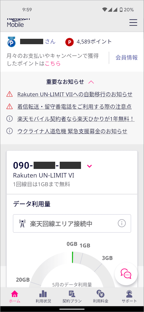それはともかく、私は家庭兼職場のWi-Fiにスマートフォンを接続していることが多く、モバイルデータ通信を月に1GBも使わないため、「月3GBまで月額1078円(税込)」の楽天モバイルにはメリットがありません。