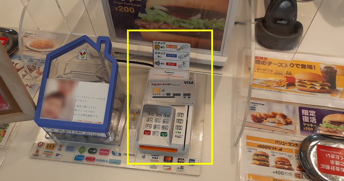 マクドナルドのNFCリーダーに置いた楽天銀行ベーシックデビットカード(Visa)