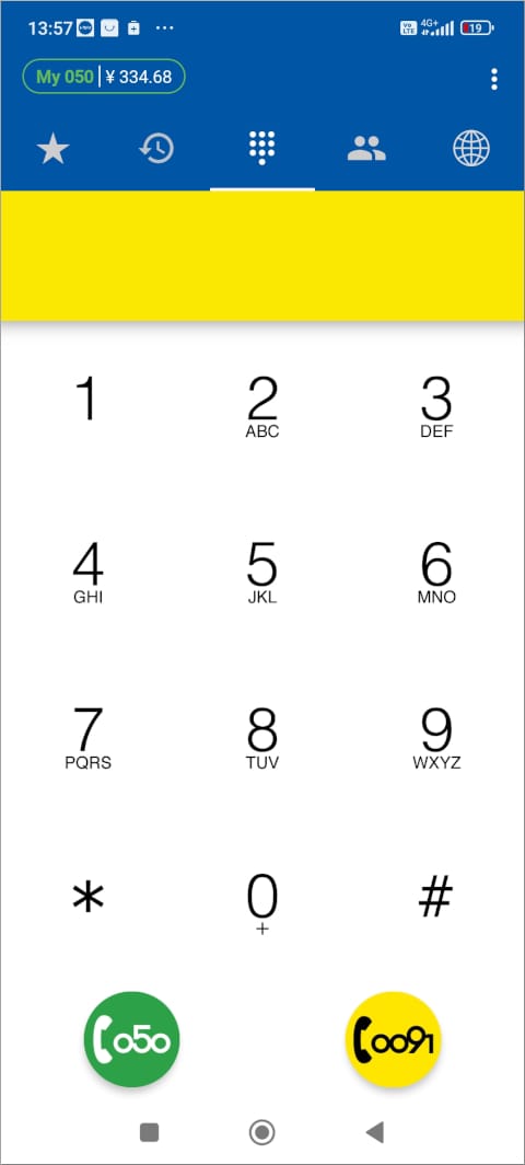 ダイヤル画面には発話ボタンが「050」と「0091」の2種類あります。また、残高は334.68円で、550円を下回っています。